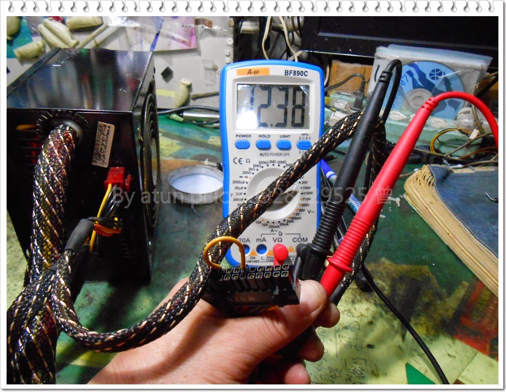 大部分的電源供應器的輸出電壓,都會以顏色導線來做區分,而大部分的待機電壓就都以綠色導線使用之,剛剛上頭就是量測24PIN口的綠色部位,因而得知本ㄎ電源,並無待機電壓輸出~