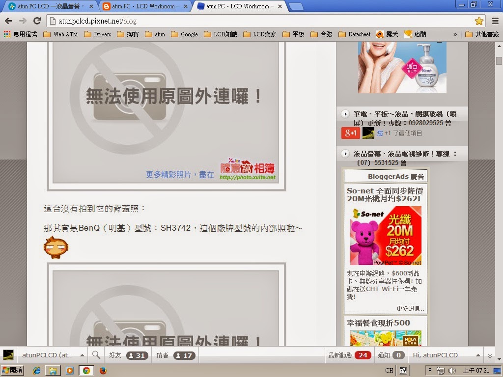 由予~將PO文的內容改到『Xuite』內去鋪設後,先前在複製維修文到別的Blog時,並不會發生圖片無法連結的困擾,可是最近除了PCHome會發生外,今天一開啟網頁,連PIXNET的網頁也呈現無法連結的窘境,看來那『Xuite』無法長期這樣作業,因此~今天起再回來『谷歌』這邊編輯,試用別的手法,繼續測試看看…