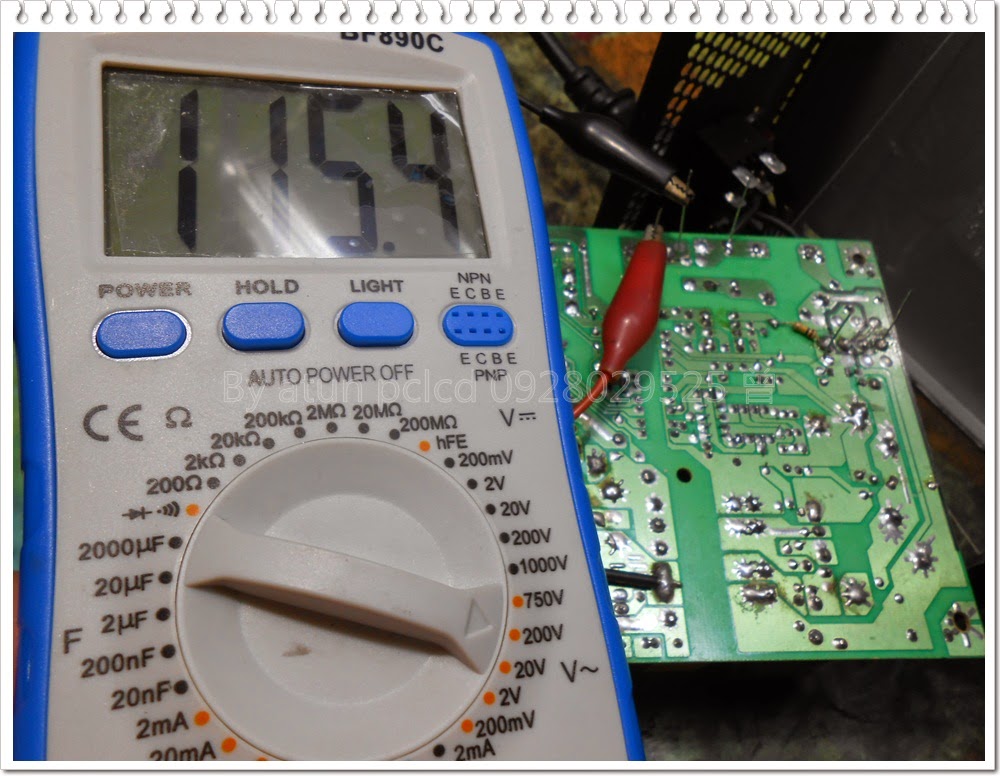 汰換更替後~剛剛未量測得到的市電電壓已經有了~也當然能量測得到橋式整流後的電壓,呼呼~待機時就衝這麼高的電壓,會不會…?