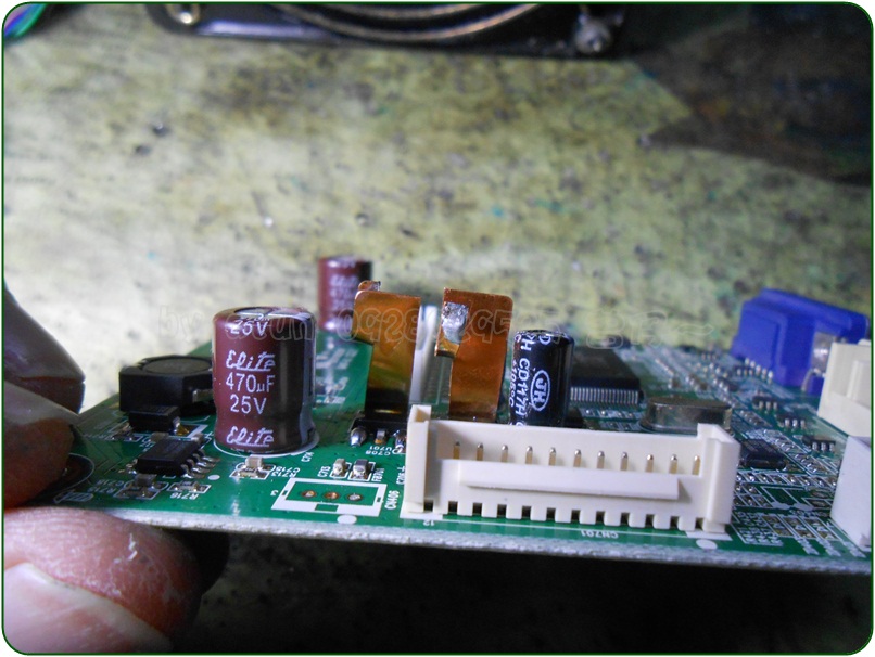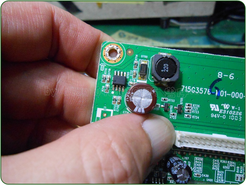 這一款公板僅能供給DC5V的面板電壓,所以~依然需要借助原機主板上的降壓電路部位所產生DC12V,來供應面板吃電…,因此,我需要去除這一塊公板上的小『MOS』開關~