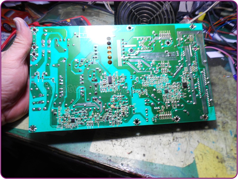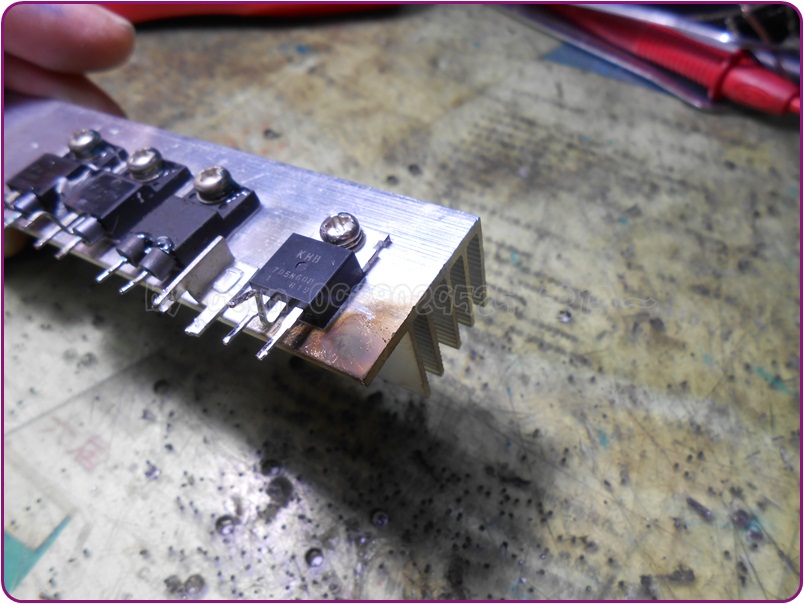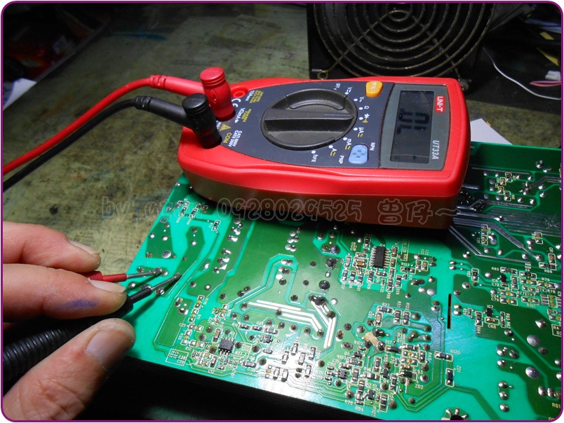 我是不會去查看以前的維修圖照的~原先也看不大出最右邊那ㄎMOS有被重焊接過(可見主人焊接功力也是不差,不愧是科班出身),再次查量結果,這才恍然大悟,經由散熱座的連接,焊回板上後D、S極間,根本就已經短路了咩~