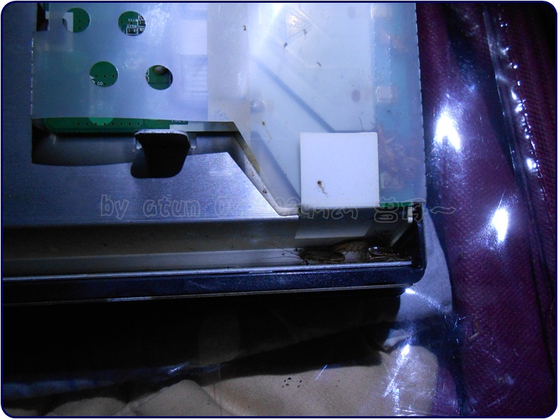 底下的圖照有些昏暗,因為那是移往戶外做拆解機器時拍攝的,現在你看到的這一個面板溝槽內,滿滿的野生小強在爬動,都是活的,呼呼…真的是我的天啊……