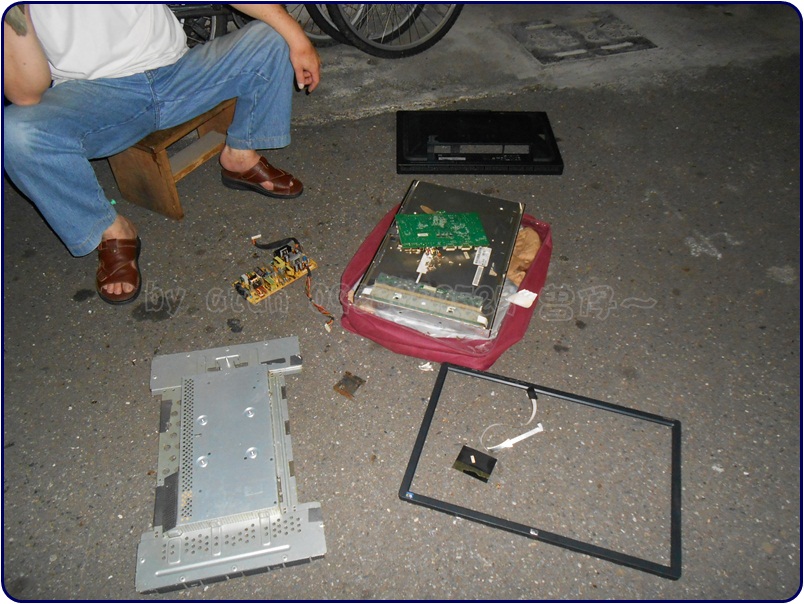 這時巷弄的柏油路上,已經散佈著拆解下來的螢幕料件……