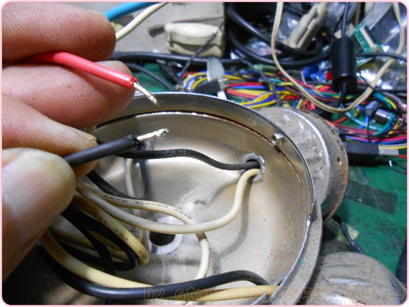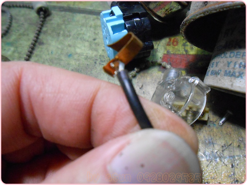 現在要將導線剝開絕緣皮,準備插入新的手拉開關內,這裡請記得將那些剝開的銅絞線上錫,上了錫的銅絞線會硬化,這樣一來~導線容易插入開關的孔內,二來開關內的銅片較容易夾住導線不易脫落~